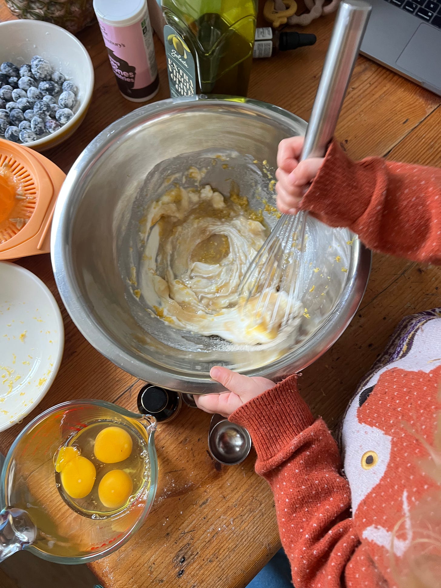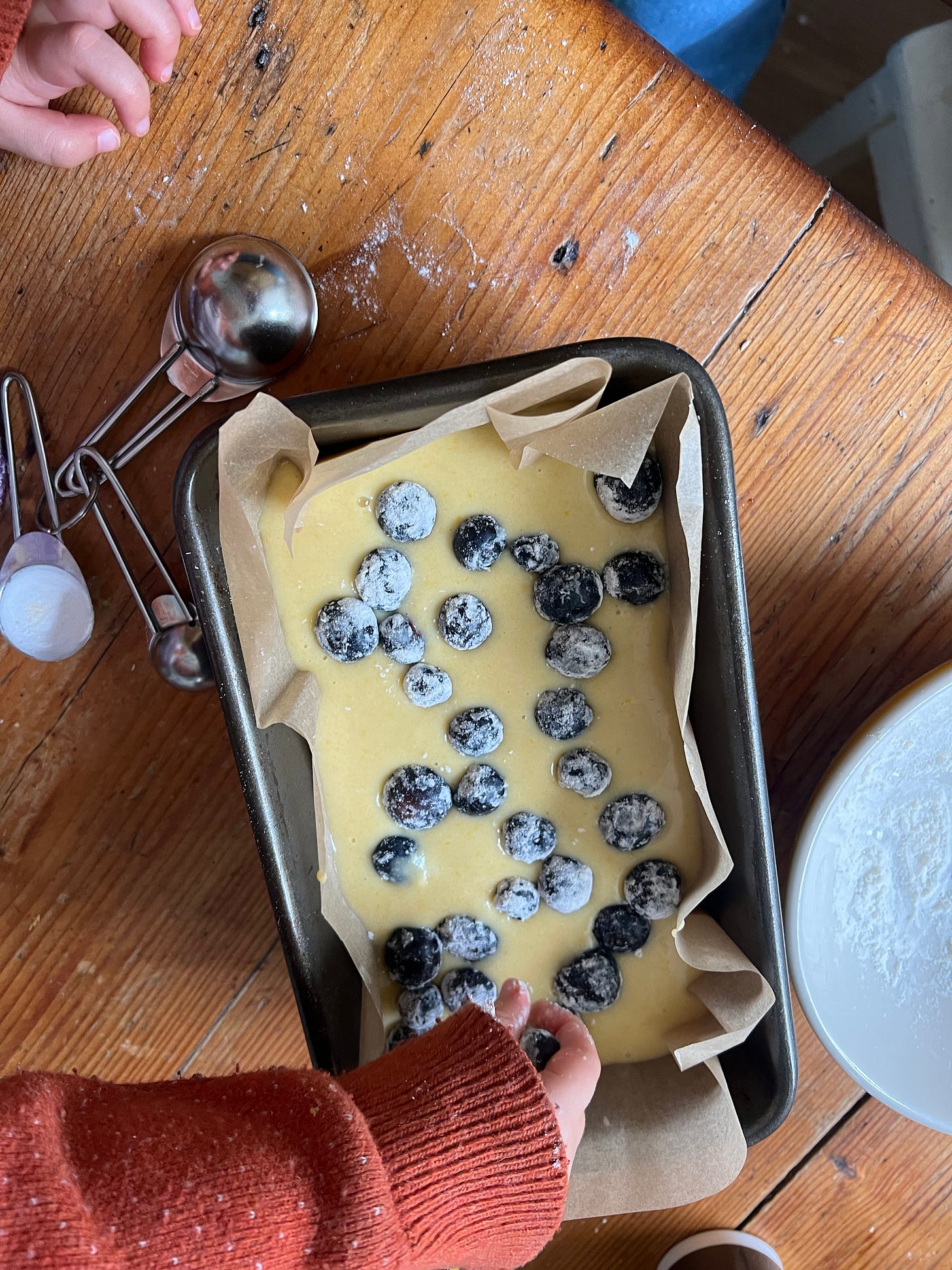 I wanted to mark his birthday with a cake, and in the spirit of keeping things simple for a baby’s palate but also classic and pleasing to everyone else who’d be eating it, I settled on a super easy yoghurt loaf cake flavoured with the sharp, fragrant zing of lemon and shot through with jammy baked blueberries. It’s something that I could easily rustle up with an enthusiastic helping hand from my three-year-old, but thanks to the yoghurt and ground almonds, it has the most luxuriously tender, delicate crumb.