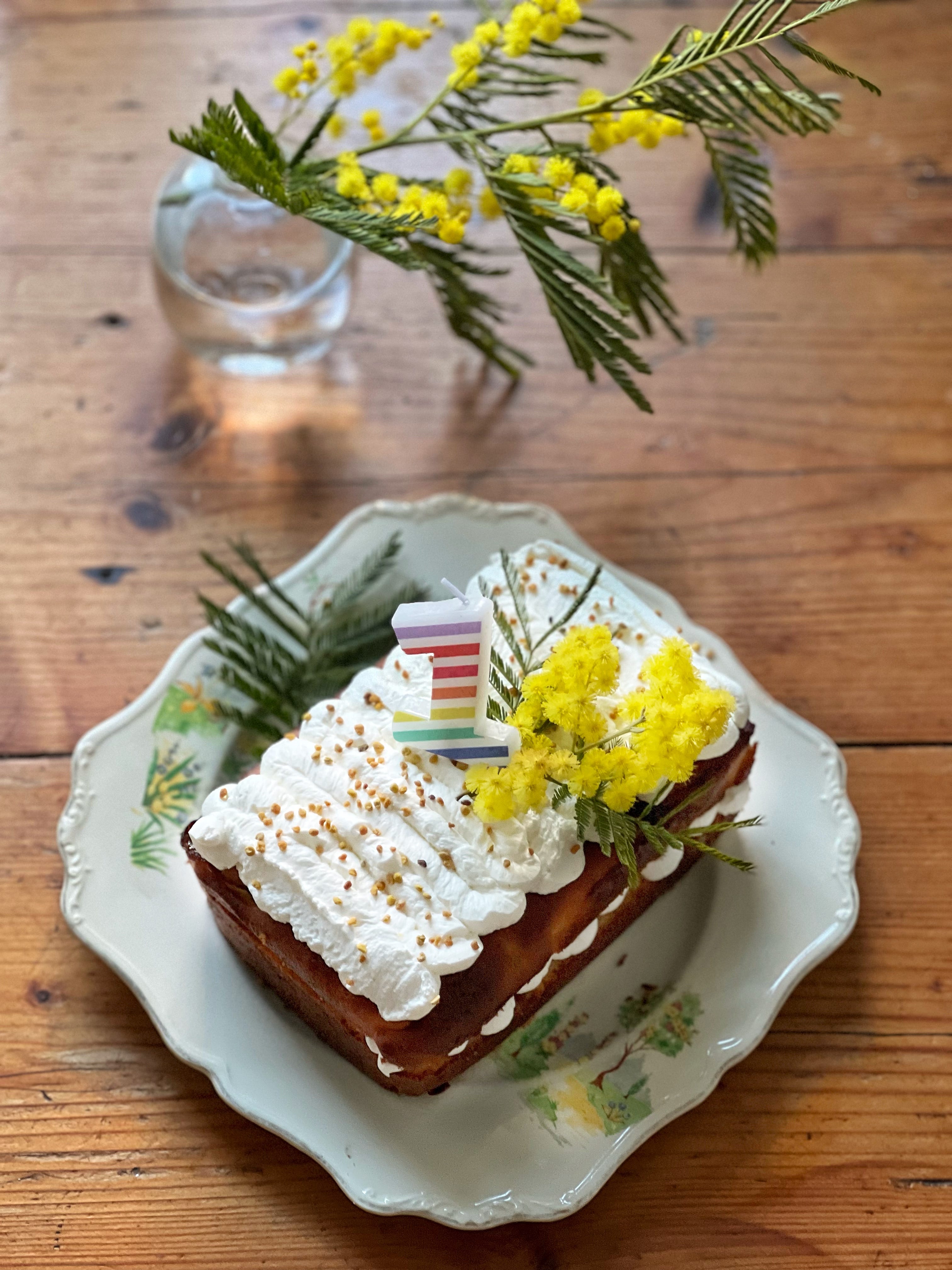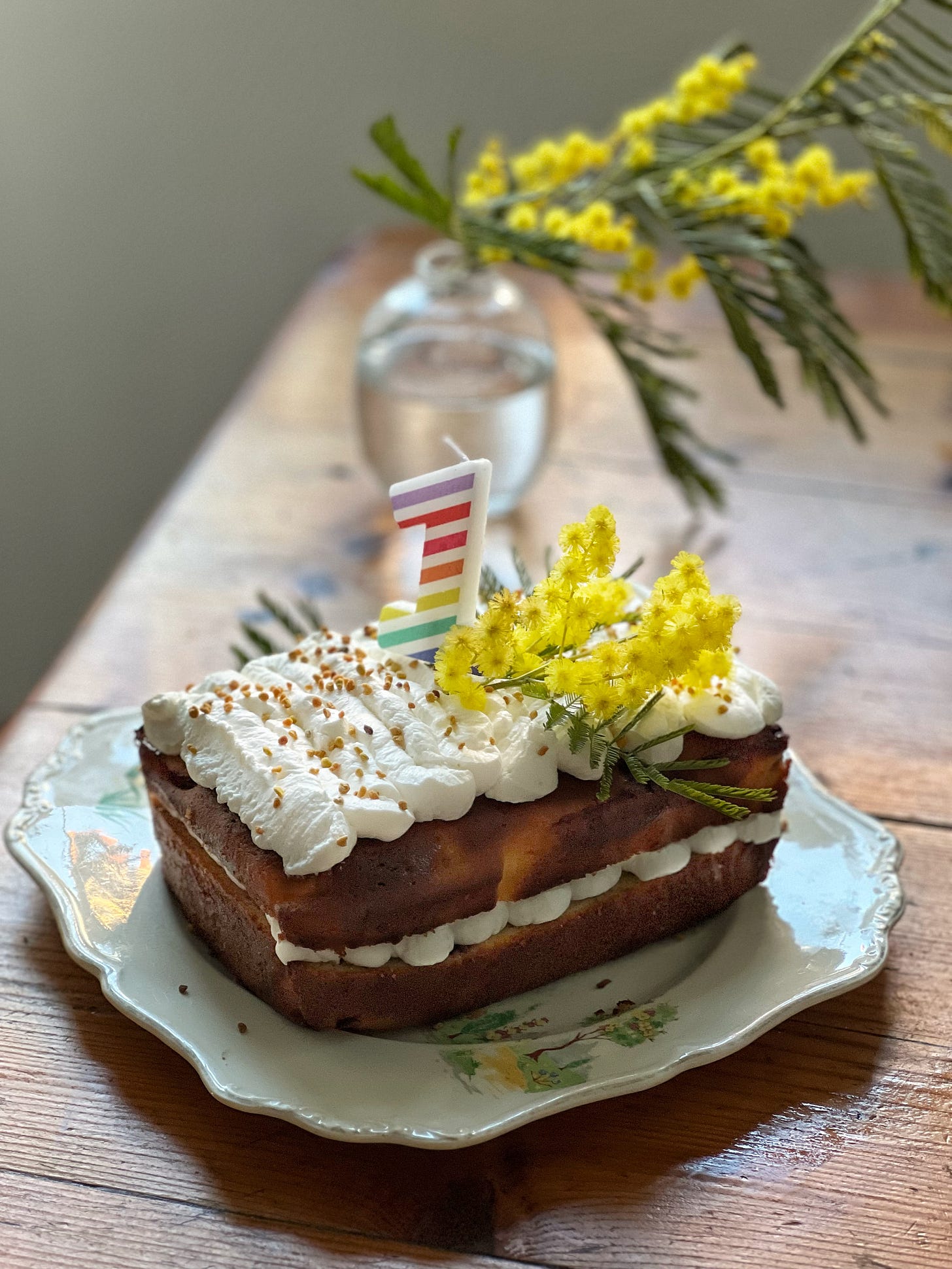 To elevate it into celebration mode – as you know I love to do – I whipped up a gorgeously light, fluffy and wonderfully sharp lemon mascarpone icing which was piped between the layers of the cake and then decorated with mimosa from the garden. I also had a jar of bee pollen I’d picked up in a French farmer’s market, and this made for the most visually stunning and delicious sprinkles. If there isn’t a French farmer’s market in your near future you can get some here, it has the most wonderful, honeyed, polleny, amazingly fragrant flavour without being actually sweet at all. Or just use normal sprinkles, I don’t mind.