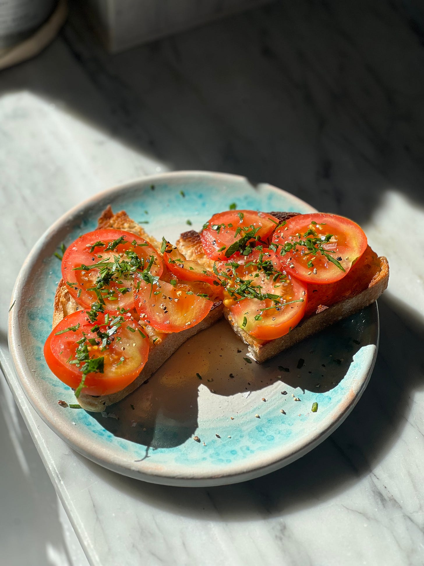 I’m absolutely a fan of the Spanish pan con tomate, with its grated tomatoes and garlic-rubbed bread, and I love a tomato bruschetta too, with olive oil and basil, but my go-to take on the delicacy is a little more British. There’s no garlic, because I do find it can distract, and rather than olive oil, I use good salted butter - enough that it’s soaking down onto the plate through the holes in the toasted sourdough. We have a great sourdough supplier, via our local deli Arnos, and I like it to be sliced medium thick, toasted until golden, nutty and crisp at the surface but still a little spongy within, and buttered while hot. You may baulk at that detail (like, duh! of course), but my dad and some people of his generation liked to insist on cooling his toast in a toast rack and then buttering it generously once cool, so that the butter formed a visibly creamy layer. I do this very occasionally, with marmalade or Marmite, but for this, I want my butter melted and mingling with those slurpy tomato juices.